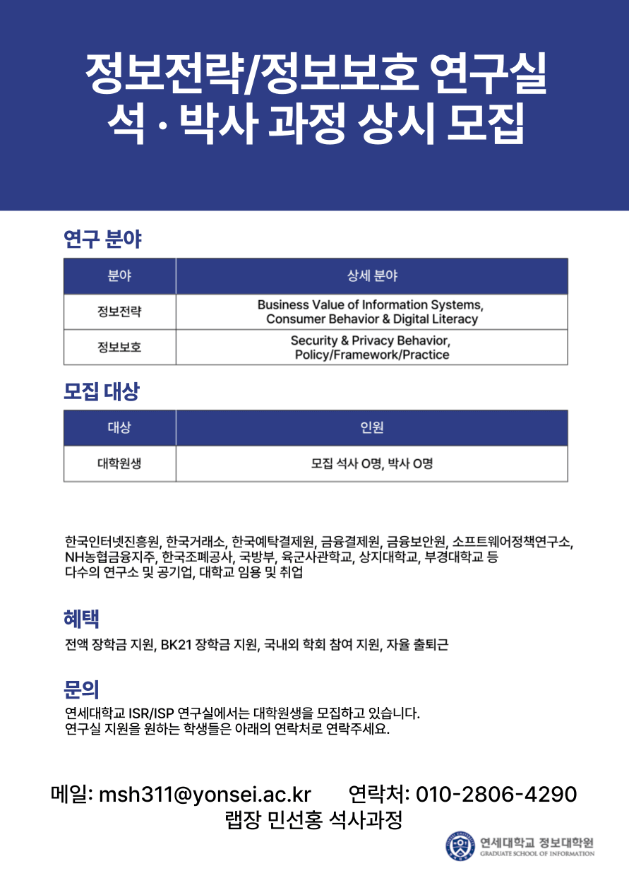 연세대학교 정보대학원 AI 정보전략/정보보호 연구실 (지도교수: 김범수 교수)